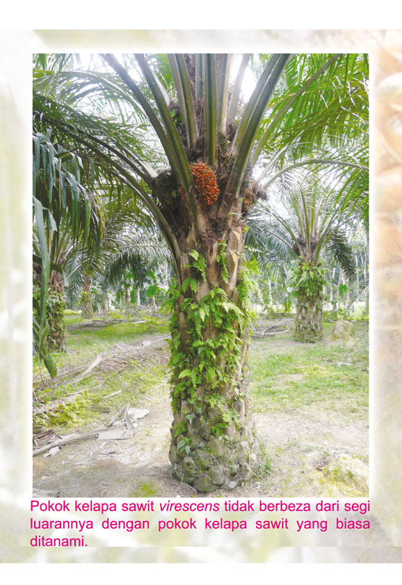 Kelapa sawit virescens ini juga spesis Elaeis guinenesis. Dari proses pembiakbakaan antara Elaeis guinenesis dan Elaeis oleifera (kelapa sawit benua Amerika) bagi menghasilkan baka-baka sawit yang menyebatikan pelbagai ciri unik dari kedua-dua spesis kelapa sawit ini, telah menyebabkan kewujudan sebatang dua pokok kelapa sawit virescens di ladang sawit sini sana. Memandangkan buah tandan segar kelapa sawit virescens juga diterima oleh kilang sawit, kewujudannya itu justeru tidak menimbulkan sebarang masalah kepada pengusaha tanaman yang mempunyai pokok sawit virescens di ladang.