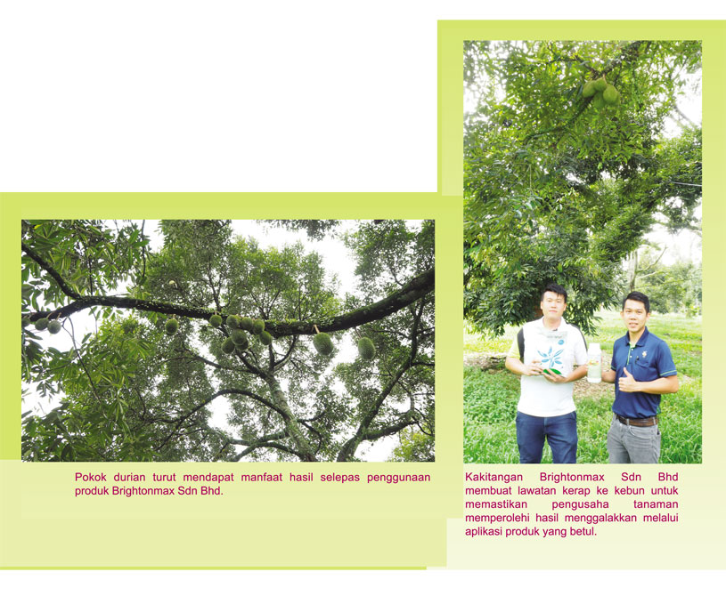 Sebuah ladang durian berhampiran yang diusahakan oleh Encik Tee turut mendapat manfaat daripada penggunaan produk berasaskan kalsium-boron serta Naturamin-WSP dan Cytoplant-400 kerana pembungaan dan pembuahan pokok durian di situ telah diperkasakan serta selanjutnya mempertingkatkan kualiti buah durian dengan hanya dua pusingan penggunaan. Untuk maklumat lanjut sila hubungi Brightonmax Sdn Bhd di talian : 07-595 3580/595 3680.