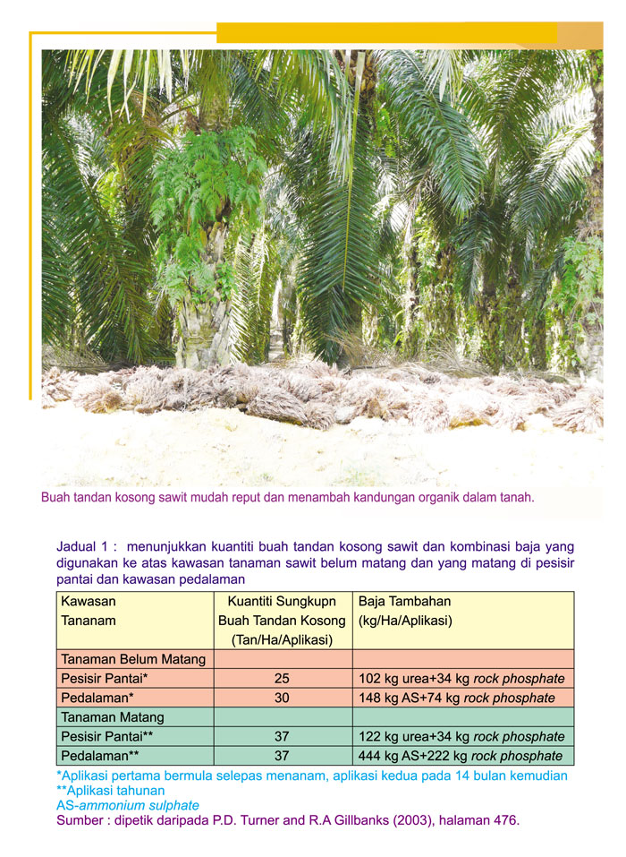 Bagi kawasan sawit matang, kuantiti buah tandan kosong yang perlu digunakan adalah berbeza-beza mengikut keadaan. Ada pihak yang mencadangkan penggunaan 75 tan/ha serta ditokok tambah 0.75 kg urea dan 1 kg rock phosphate pada setiap pokok. Kombinasi ini dijangka dapat memenuhi keperluan nutrien tanaman sawit buat selama 12 – 18 bulan. Kaedah atau amalan ini diulang semula pada setiap 3 – 4 tahun. Jadual 1 menunjukkan cadangan kuantiti penggunaan buah tandan kosong sawit dan kombinasi baja pada ladang sawit belum matang dan yang matang.