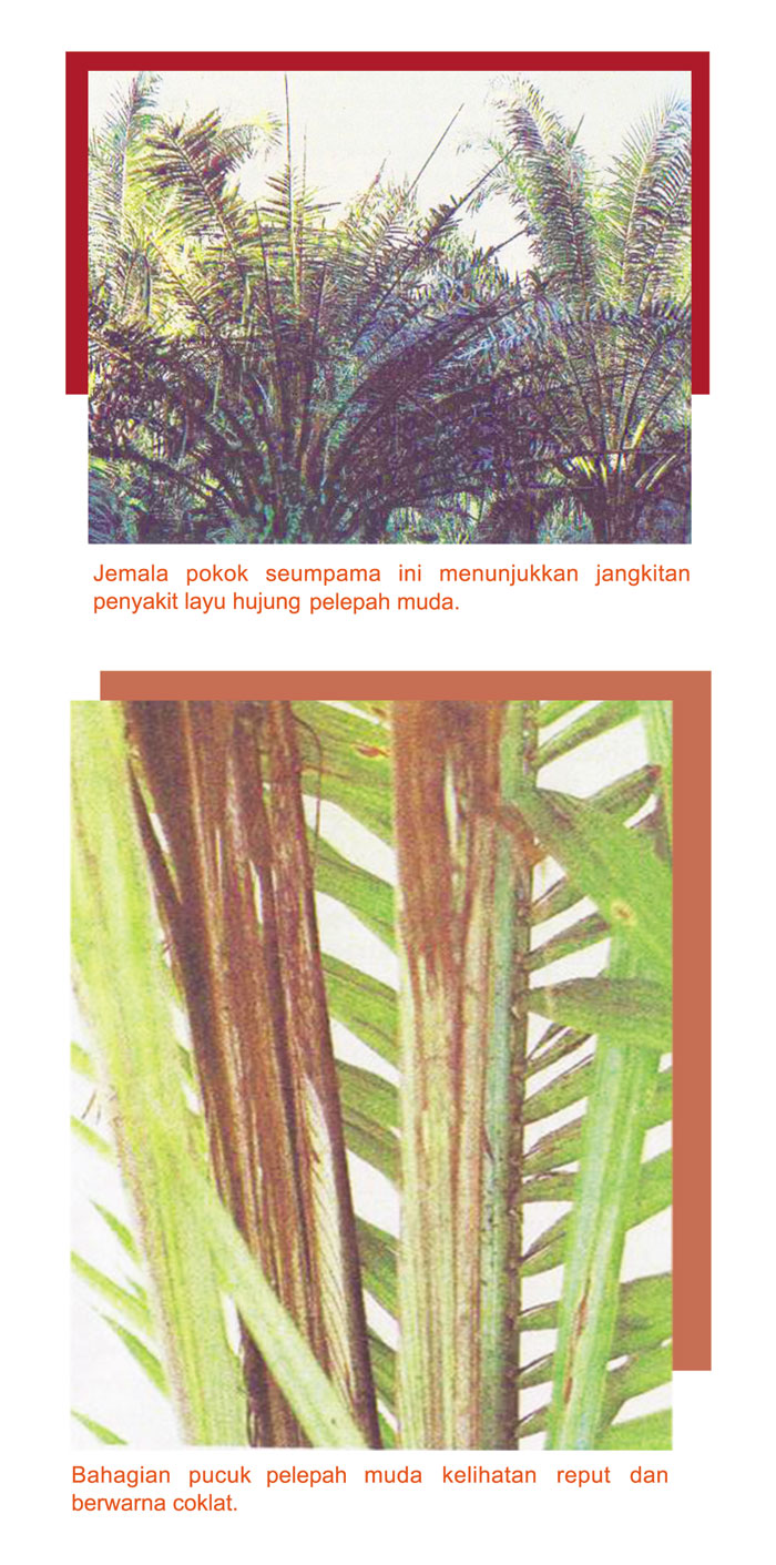 Simtom pertama penyakit ini bermula dengan reputan pada hujung pelepah muda yang masih belum berkembang. Bahagian reputan nampaknya basah serta berwarna hitam coklat dan dihinggapi oleh fungi serta mikroorganisma termasuk spora fusarium. Perkembangan pelepah muda selanjutnya menunjukkan 1/2 atau 1/3 daripada pelepah tersebut ketiadaan lai daun di bahagian rakis akibat reputan sebelum ini. Proses reputan akan berhenti apabila pelepah semakin matang. Bahagian rakis yang reput akan terus kering dan layu, kemudian gugur ke permukaan tanah apabila ditiup angin.